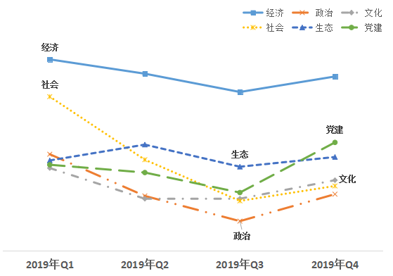 從六大領(lǐng)域來看,經(jīng)濟(jì)領(lǐng)域得分78.41,政治領(lǐng)域得分65.95,文化領(lǐng)域得分67.43,社會(huì)領(lǐng)域得分66.82,生態(tài)領(lǐng)域得分69.89,黨建領(lǐng)域得分71.43。經(jīng)濟(jì)領(lǐng)域改革熱度值仍居首位,黨建領(lǐng)域名列第二,生態(tài)領(lǐng)域超越文化、社會(huì)領(lǐng)域,位于第三;與三季度相比,六大領(lǐng)域均有明顯提升,其中黨建領(lǐng)域增加最多;