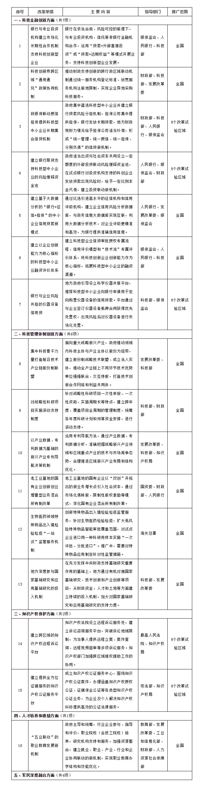 本次正式發(fā)布的20項(xiàng)改革舉措,是繼2017年首批13項(xiàng)、2018年第二批23項(xiàng)之后,由國辦發(fā)布的第3批向全國或在8個(gè)試驗(yàn)區(qū)域范圍內(nèi)復(fù)制推廣、支持創(chuàng)新的改革舉措,涵蓋了科技金融創(chuàng)新、科技管理體制創(chuàng)新、知識產(chǎn)權(quán)保護(hù)、人才培養(yǎng)和激勵(lì)和軍民深度融合5個(gè)重點(diǎn)領(lǐng)域。根據(jù)我們觀察分析,經(jīng)過了前期的沉淀,以及進(jìn)一步的實(shí)踐探索,改革進(jìn)一步走向“深處”和“實(shí)處”,這批舉措緊密呼應(yīng)當(dāng)前中央的重要改革關(guān)切,充分體現(xiàn)了“實(shí)”和“新”,在一些改革的“老大難”問題上進(jìn)一步破題。