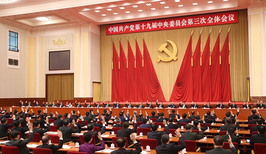 1978年12月18日至22日,中共十一屆三中全會在北京召開。陳云、鄧小平、華國鋒、葉劍英、李先念、汪東興(自左至右)在十一屆三中全會上