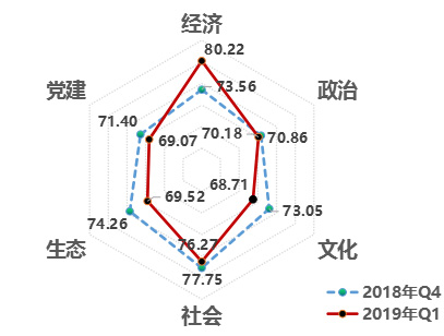 2.從領(lǐng)域來看,經(jīng)濟(jì)領(lǐng)域改革熱度一直較高。經(jīng)濟(jì)80.22,政治70.18,文化68.71,社會76.27,生態(tài)69.52,黨建69.07。六大領(lǐng)域除經(jīng)濟(jì)領(lǐng)域外,政治、文化、社會、生態(tài)、黨建領(lǐng)域均比2018年第4季度有所下降,其中生態(tài)領(lǐng)域下降4.73,降幅6.37%。從連續(xù)八個季度評估結(jié)果來看,相對其它領(lǐng)域,經(jīng)濟(jì)領(lǐng)域改革熱度指數(shù)處于高位,社會領(lǐng)域次之,文化領(lǐng)域的改革熱度指數(shù)低位運(yùn)行。