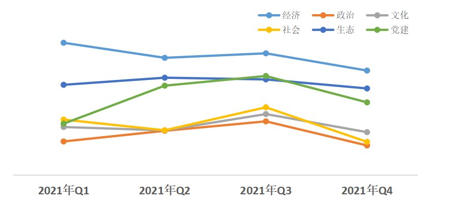 從近幾個季度的評估結(jié)果來看,除經(jīng)濟(jì)、生態(tài)領(lǐng)域,其他領(lǐng)域熱度值均在第三季度達(dá)到2021年度熱度指數(shù)峰值,但隨后呈下降趨勢。經(jīng)濟(jì)領(lǐng)域熱度值領(lǐng)先其他領(lǐng)域,政治領(lǐng)域改革熱度值偏低;社會、政治、黨建領(lǐng)域降幅較大。