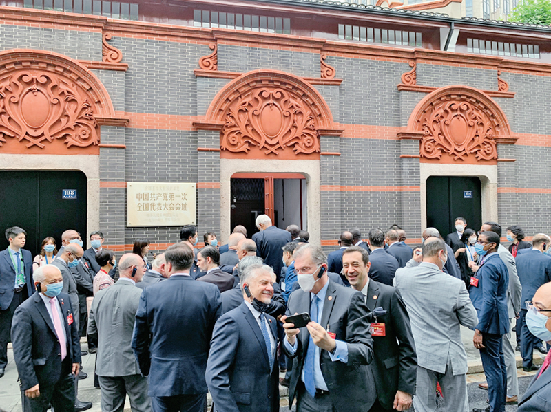2021年6月16日,“中國共產黨的故事——習近平新時代中國特色社會主義思想在上海的實踐”特別對話會在上海舉行。近100個國家、126個政黨和友好組織的740多名代表通過視頻連線參加對話會,40多個國家駐華大使現(xiàn)場出席會議。圖為與會駐華使節(jié)參觀中共一大會址。 人民網 馬作鵬/攝