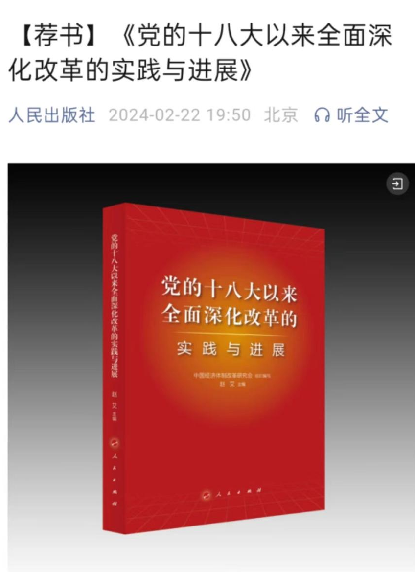2024年2月22日,由我會(huì)組織編寫,會(huì)長(zhǎng)彭森作序、常務(wù)副會(huì)長(zhǎng)兼秘書長(zhǎng)趙艾主編的《黨的十八大以來全面深化改革的實(shí)踐與進(jìn)展》一書,入選人民出版社官方微信公眾號(hào)[薦書]欄目,成為人民出版社推薦的新書。