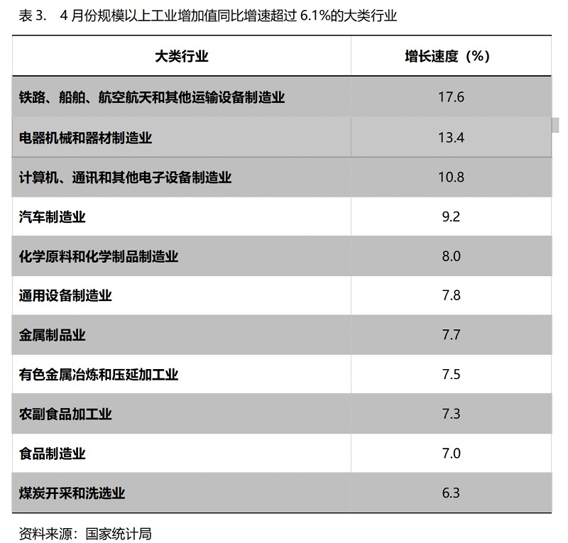 4月份,增長速度超過規(guī)模以上工業(yè)增長6.1%的主要大類行業(yè)共有11個,即鐵路、船舶、航空航天和其他運輸設(shè)備制造業(yè)增長17.6%,電器機械和器材制造業(yè)增長13.4%,計算機、通訊和其他電子設(shè)備制造業(yè)增長10.8%,汽車制造業(yè)增長9.2%,化學(xué)原料和化學(xué)制品制造業(yè)增長8.0%,通用設(shè)備制造業(yè)增長7.8%,金屬制品業(yè)增長7.7%,有色金屬冶煉和壓延加工業(yè)增長7.5%,農(nóng)副食品加工業(yè)增長7.3%,食品制造業(yè)增長7.0%,煤炭開采和洗選業(yè)增長6.3%。