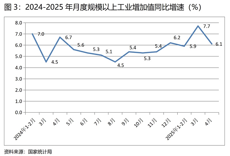 (三)工業(yè)增速由升轉(zhuǎn)落。4月份,規(guī)模以上工業(yè)增加值同比增長6.1%,比上月增長7.7%回落了1.6個百分點,3月份比1-2月份回升了1.8個百分點。4月份工業(yè)增速出現(xiàn)回落,有上年同期高基數(shù)的因素,上年4月份增長6.7%,如按兩年平均計算,增速為6.4%。從工業(yè)三大門類看,回落最多的是采礦業(yè),4月份比3月份回落了3.6個百分點,電力、熱力、燃氣及水生產(chǎn)和供應(yīng)業(yè)回落了1.4個百分點,制造業(yè)回落了1.3個百分點。