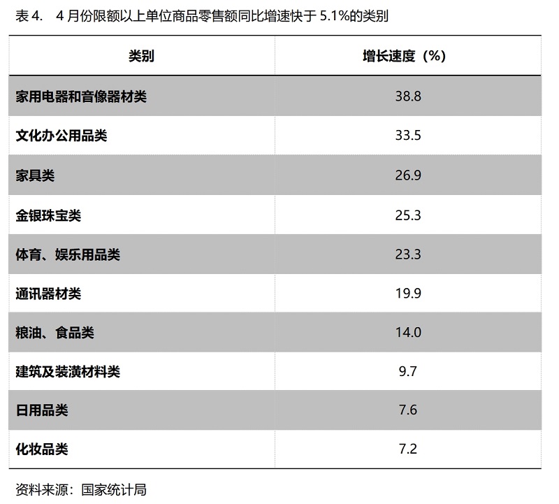 4月份,限額以上單位商品零售額增速快于社會消費品零售總額5.1%增速的共有10類,即家用電器和音像器材類增長38.8%,文化辦公用品類增長33.5%,家具類增長26.9%,金銀珠寶類增長25.3%,體育、娛樂用品類增長23.3%,通訊器材類增長19.9%,糧油、食品類增長14.0%,建筑及裝潢材料類增長9.7%,日用品類增長7.6%,化妝品類同比增長7.2%。