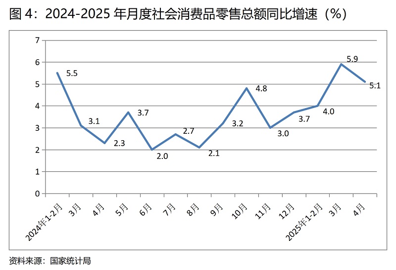 (四)零售增速由升轉(zhuǎn)落。4月份,社會消費品零售總額同比增長5.1%,比3月份增長5.8%回落了0.7個百分點,3月份比1-2月份增長4.0%回升了1.9個百分點。4月份社會消費品零售總額增速的回落,盡管有汽車及其油價下降的因素,但應(yīng)看到這是在上年同期基數(shù)較低基礎(chǔ)上的回落,說明消費需求不足的問題仍還比較突出,在面對較大不確定性的國際局勢,研究謀劃更加有效的擴大消費特別是服務(wù)消費的政策措施顯得十分重要。