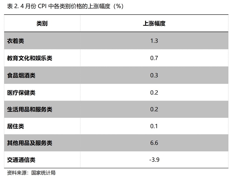 4月份,在CPI 8個類別中有7個類別保持上漲,1個類別下降。上漲的7個類別包括衣著類價格同比上漲1.3%,教育文化和娛樂類上漲0.7%,食品煙酒類上漲0.3%,醫(yī)療保健類上漲0.2%,生活用品及服務(wù)類上漲0.2%,居住類上漲0.1%,其他用品和服務(wù)類上漲6.6%;下降的雖然就交通通信類1個類別,但降幅較大,4月份同比下降3.9%。