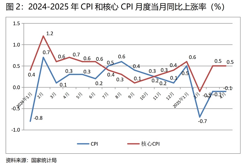(二) CPI降幅與上月持平。4月份,CPI同比下降0.1%,與3月份下降0.1%持平, CPI已連續(xù)3個月下降,也是自上年2月份以來再次出現(xiàn)的下降;4月份,核心CPI同比上漲0.5%,與3月份上漲0.5%持平。CPI保持下降的趨勢,雖然有國際石油價格下降因素的影響,但核心CPI仍保持在低位運行,說明需求特別是消費需求仍還較為偏弱,擴大需求特別是消費需求還需要進一步加大力度。
