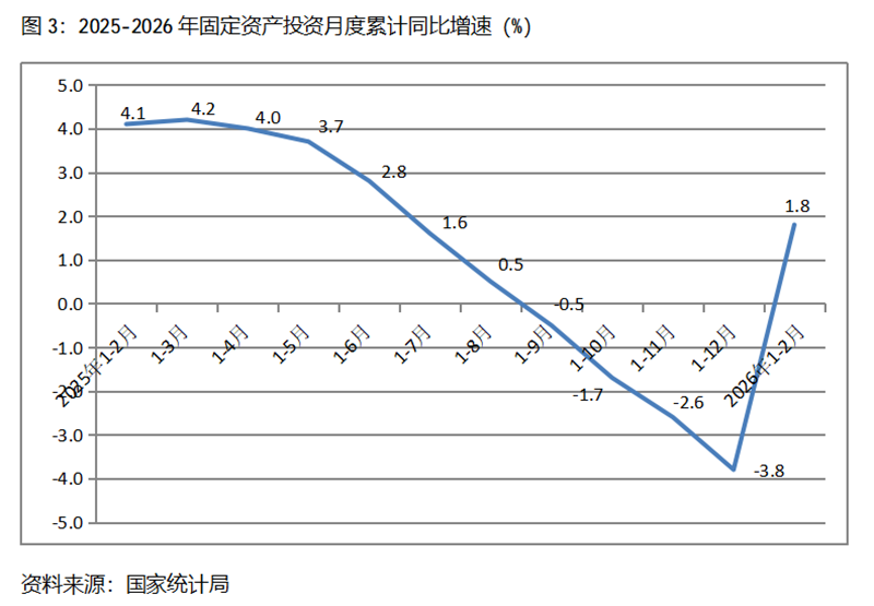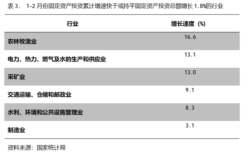 1-2月份,固定資產投資累計增速快于或持平固定資產投資總額增長1.8%的行業(yè)共6個,即農林牧漁業(yè)增長16.6%,電力、熱力、燃氣及水的生產和供應業(yè)增長13.1%,采礦業(yè)增長13.0%,交通運輸、倉儲和郵政業(yè)增長9.1%,水利、環(huán)境和公共設施管理業(yè)增長8.3%,制造業(yè)增長3.1%。
