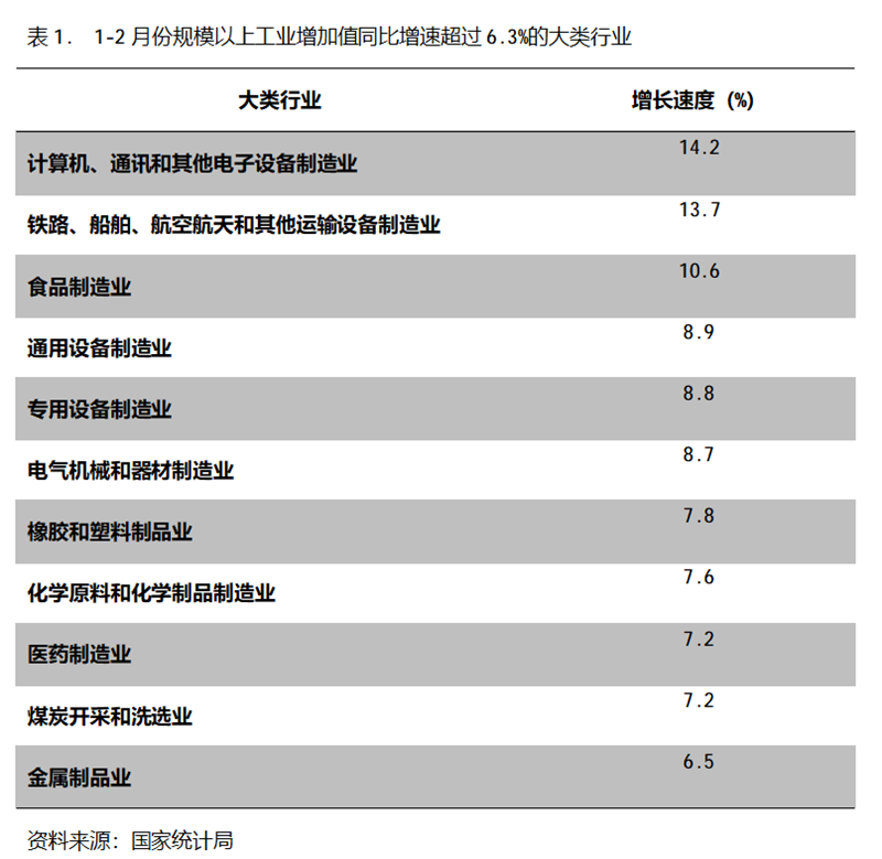 1-2月份,增長速度超過或持平規(guī)模以上工業(yè)增長6.3%的主要大類行業(yè)共有11個,即計算機、通訊和其他電子設備制造業(yè)增長14.2%,鐵路、船舶、航空航天和其他運輸設備制造業(yè)增長13.7%,食品制造業(yè)增長10.6%,通用設備制造業(yè)增長8.9%,專用設備制造業(yè)增長8.8%,電氣機械和器材制造業(yè)增長8.7%,橡膠和塑料制品業(yè)增長7.8%,化學原料和化學制品制造業(yè)增長7.6%,醫(yī)藥制造業(yè)增長7.2%,煤炭開采和洗選業(yè)增長7.2%,金屬制品業(yè)增長6.5%。