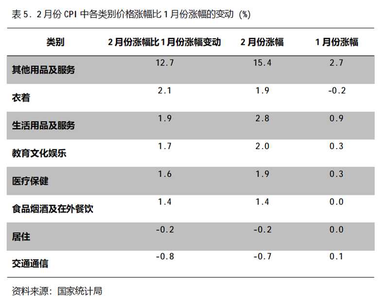 2月份,在CPI 8個類別中有6個類別同比漲幅回升,2個類別回落。漲幅回升的5個類別包括其他用品及服務漲幅回升12.7個百分點,衣著由降轉漲、漲幅回升2.1個百分點,生活用品及服務漲幅回升1.9個百分點,教育文化娛樂漲幅回升1.7個百分點,醫(yī)療保健漲幅回升1.6個百分點,食品煙酒及在外餐飲價格由平轉漲、漲幅回升1.4個百分點,居住由平轉降、降幅擴大0.2個百分點,交通通信由漲轉降、降幅擴大0.8個百分點。
