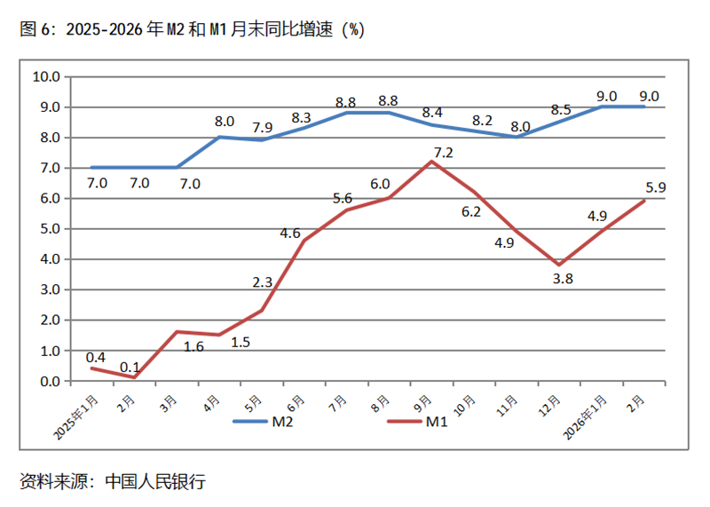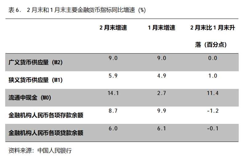 六、M2增速由升轉平。2月末,廣義貨幣供應量(M2)同比增長9.0%,與1月份末增長9.0%持平,1月末增幅比上年末增長8.5%回升0.5個百分點;狹義貨幣供應量(M1)同比增長5.9%,比1月末增長4.9%回升1.0個百分點,1月末增幅比上年末增長3.8%回升1.1個百分點;流通中貨幣(M0)同比增長14.1%,比1月末增長2.7%回升11.4個百分點,1月末增幅比上年末增長10.2%回落7.5個百分點。2月末,雖然M2增速與M1增速差距進一步縮小,但仍還保持著不小的差距。