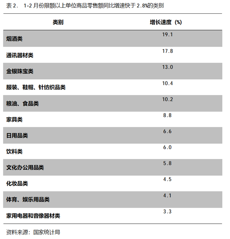 1-2月份,限額以上單位商品零售額同比增速快于社會消費品零售總額2.8%增速的共有12類,即煙酒類增長19.1%,通訊器材類增長17.8%,金銀珠寶類增長13.0%,服裝、鞋帽、針紡織品類增長10.4%,糧油、食品類增長10.2%,家具類增長8.8%,日用品類增長6.6%,飲料類增長6.0%,文化辦公用品類增長5.8%,化妝品類增長4.5%,體育、娛樂類增長4.1%,家用電器和音像類增長3.3%。