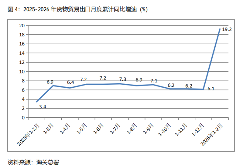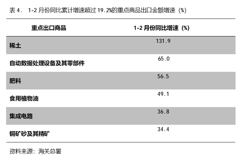 1-2月份,出口金額同比增速超過19.2%的重點商品共有6類,即稀土出口同比增長131.9%,自動數據處理設備及其零部件增長65.0%,肥料出口增長56.5%,食用植物油增長49.1%,集成電路增長36.8%,銅礦砂及其精礦增長34.4%。