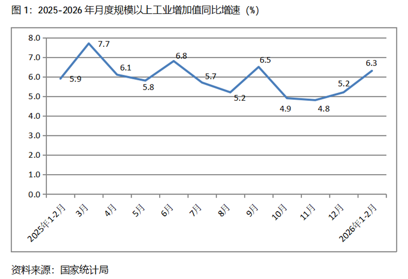 一、工業(yè)增速持續(xù)回升。1-2月份,規(guī)模以上工業(yè)增加值同比增長6.3%,比上年12月份增長5.2%回升了1.1個百分點,上年12月份比上年11月份增長4.8%回升了0.4個百分點。從工業(yè)三大門類看,采礦業(yè)、制造業(yè)和電力、熱力、燃氣及水生產和供應業(yè)增速比上年12月份全面回升,1-2月份,采礦業(yè)同比增長6.1%,比上年12月份增長5.6%回升0.5個百分點;制造業(yè)增長6.6%,比上年12月份增長6.4%回升0.2個百分點;電力、熱力、燃氣及水生產和供應業(yè)增長4.7%,比上年12月份增長2.3回升2.4個百分點。