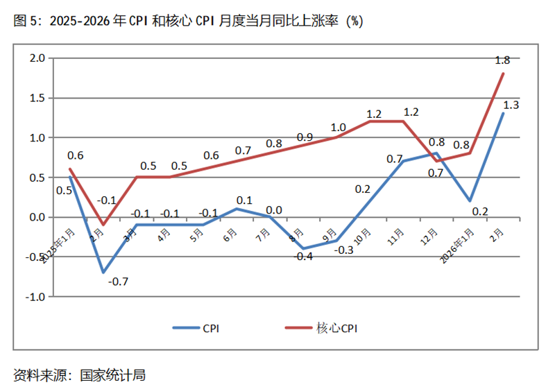 五、CPI漲幅由落轉升。2月份,CPI同比上漲1.3%,比1月份上漲0.2%回升了1.1個百分點,1月份漲幅比上年12月份回落0.6個百分點;核心CPI同比上漲1.8%,比1月份上漲0.8%回升1.0個百分點,1月份漲幅比上年12月份回升0.1個百分點。由于上年2月份CPI下降0.7%、基數較低,今年和上年2月份CPI兩年平均僅上漲0.3%,CPI漲幅是否將走出低速運行的態(tài)勢,還有待進一步的觀察。