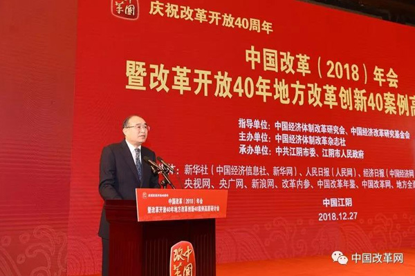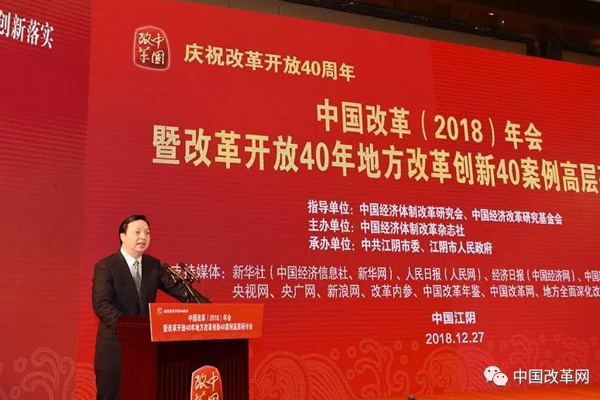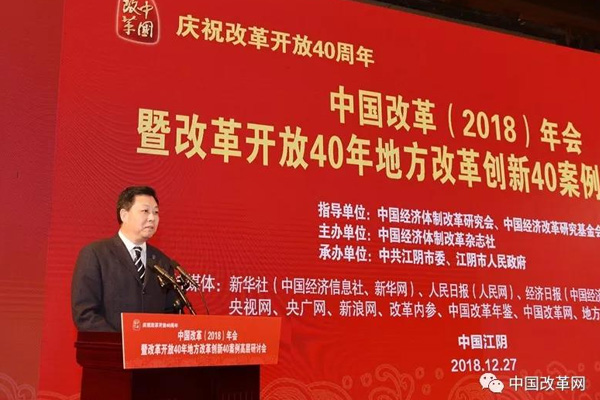 2018年12月27日,由中國經(jīng)濟(jì)體制改革研究會、中國經(jīng)濟(jì)改革研究基金會指導(dǎo),中國經(jīng)濟(jì)體制改革雜志社主辦,中共江陰市委、江陰市人民政府承辦的“慶祝改革開放40周年——中國改革(2018)年會暨改革開放40年地方改革創(chuàng)新40案例高層研討會”在江蘇省江陰市召開。